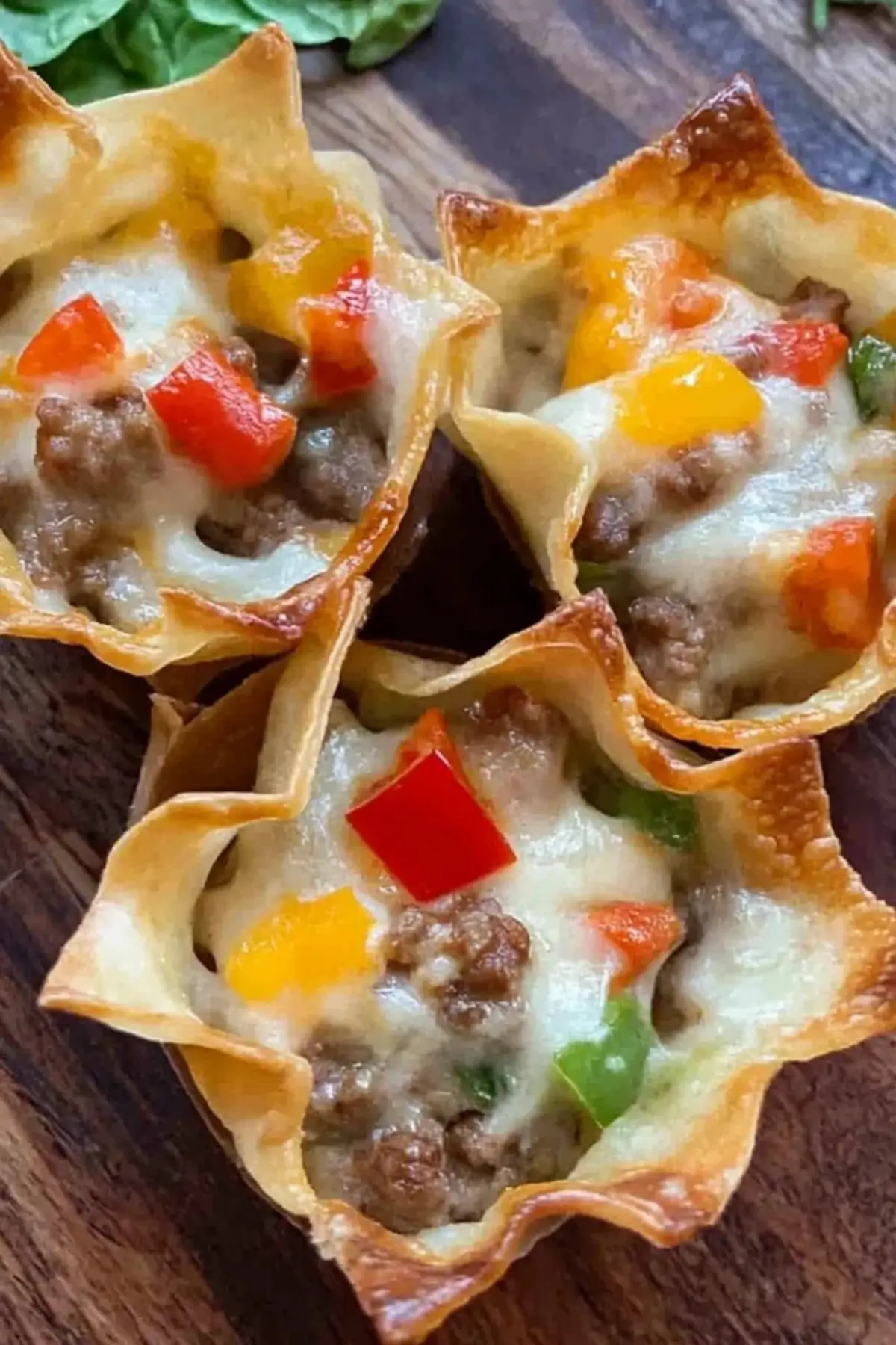 - Return filled cups to oven and bake an additional 5–10 minutes until the cheese is melted and the wonton edges are golden brown.